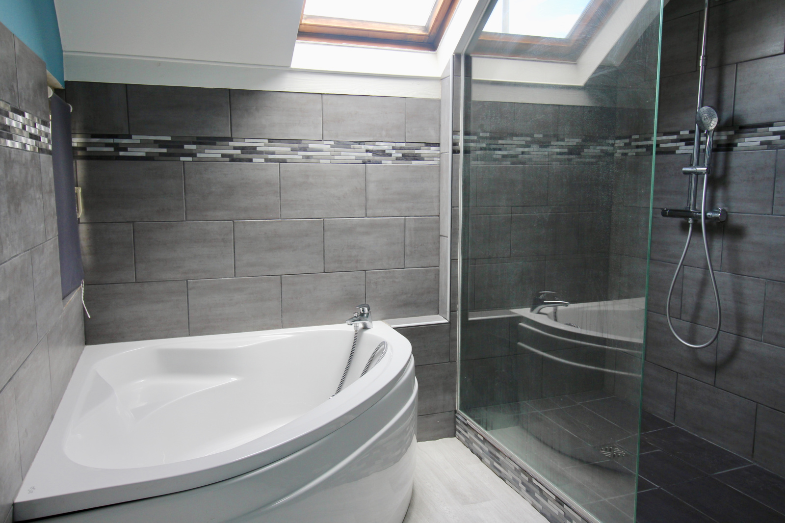 Vous trouverez également une grande salle de bains (avec baignoire, douche, meuble double vasque, WC, sèche-serviette).