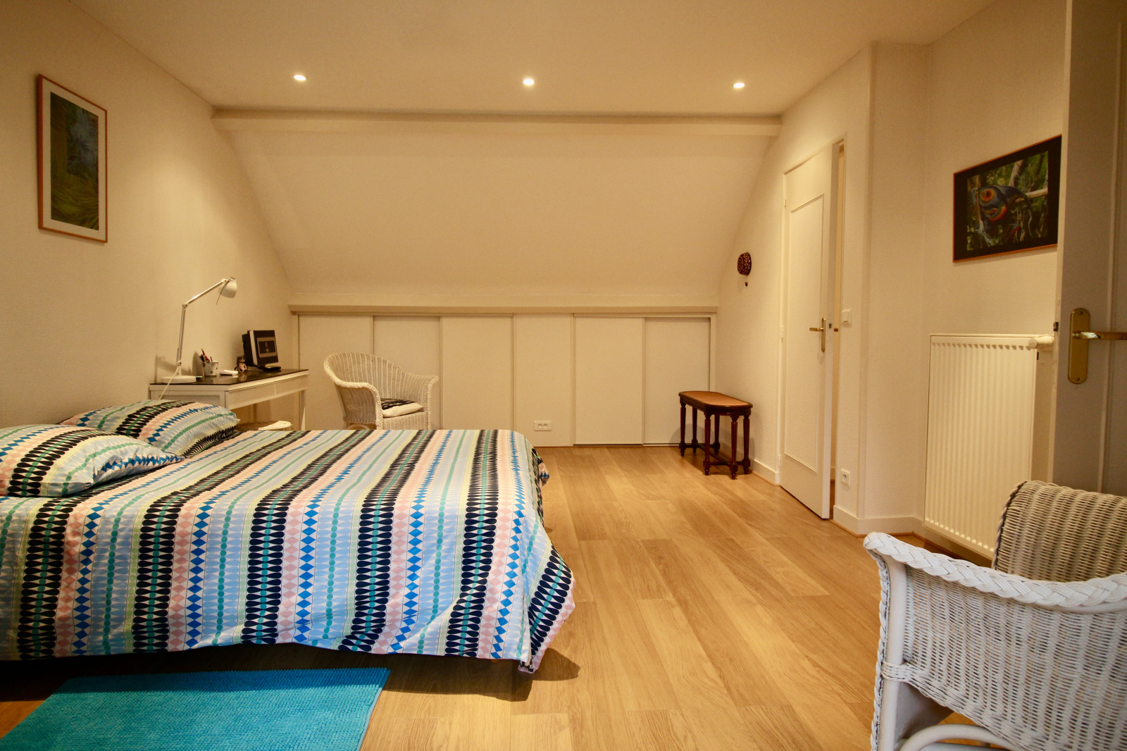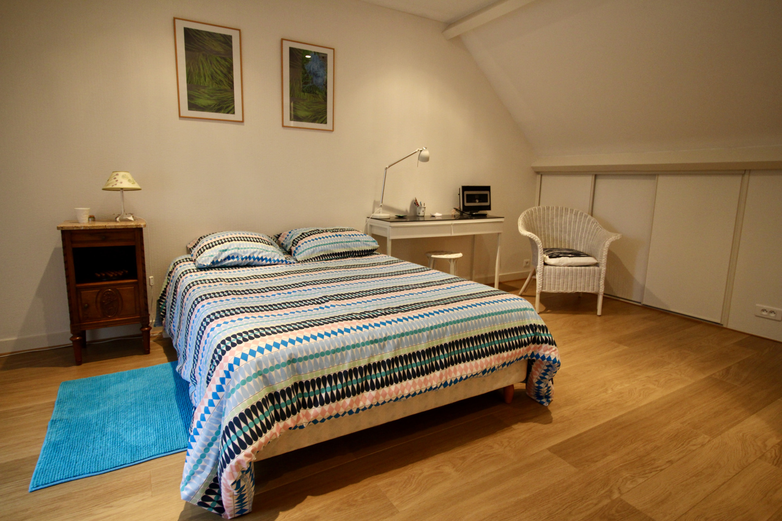 A l'étage, vous aurez un second espace nuit composé de deux grandes chambres mansardées avec rangements et une salle d'eau tout confort.
