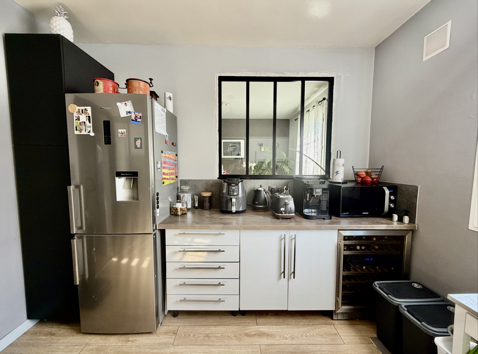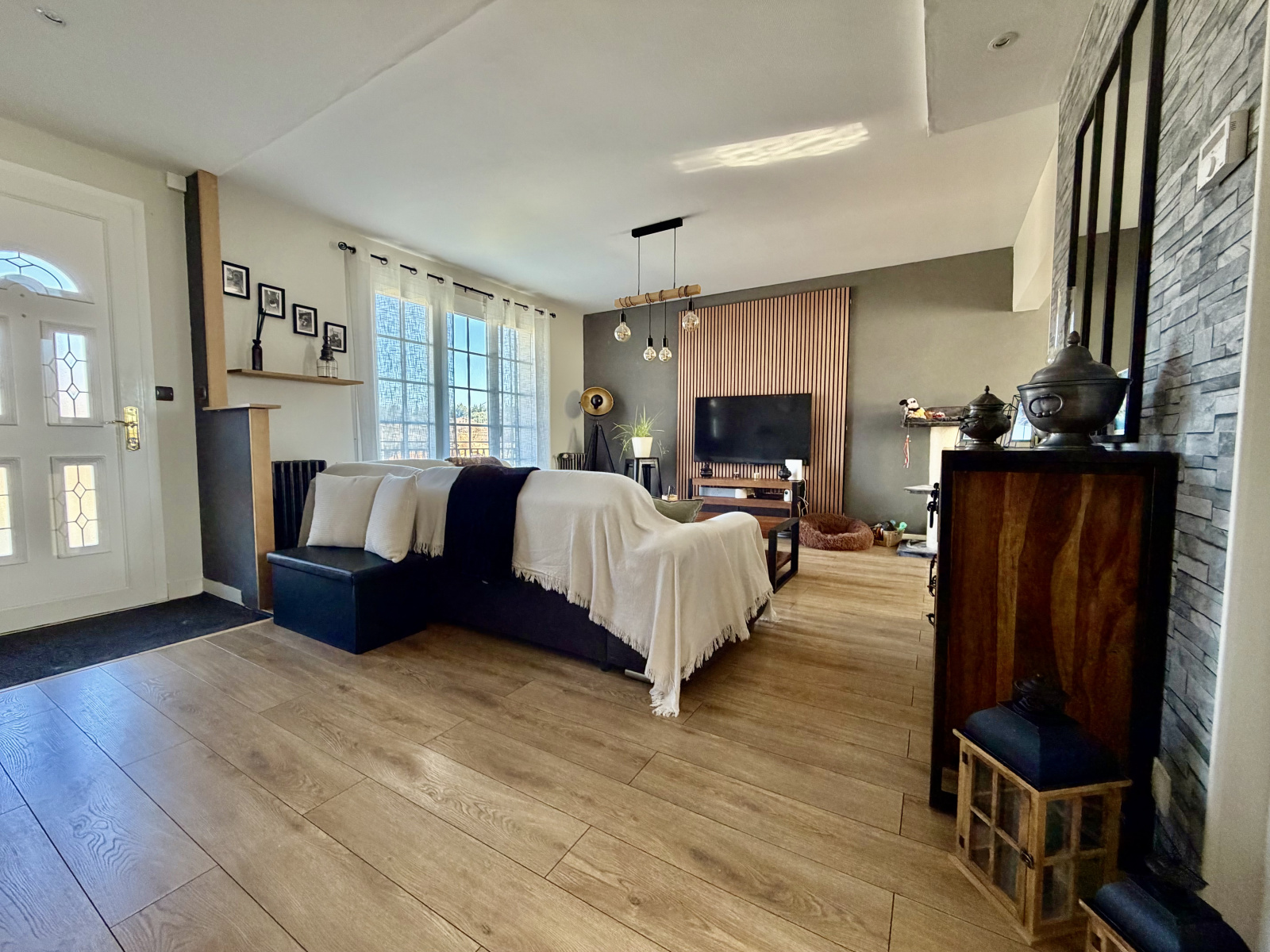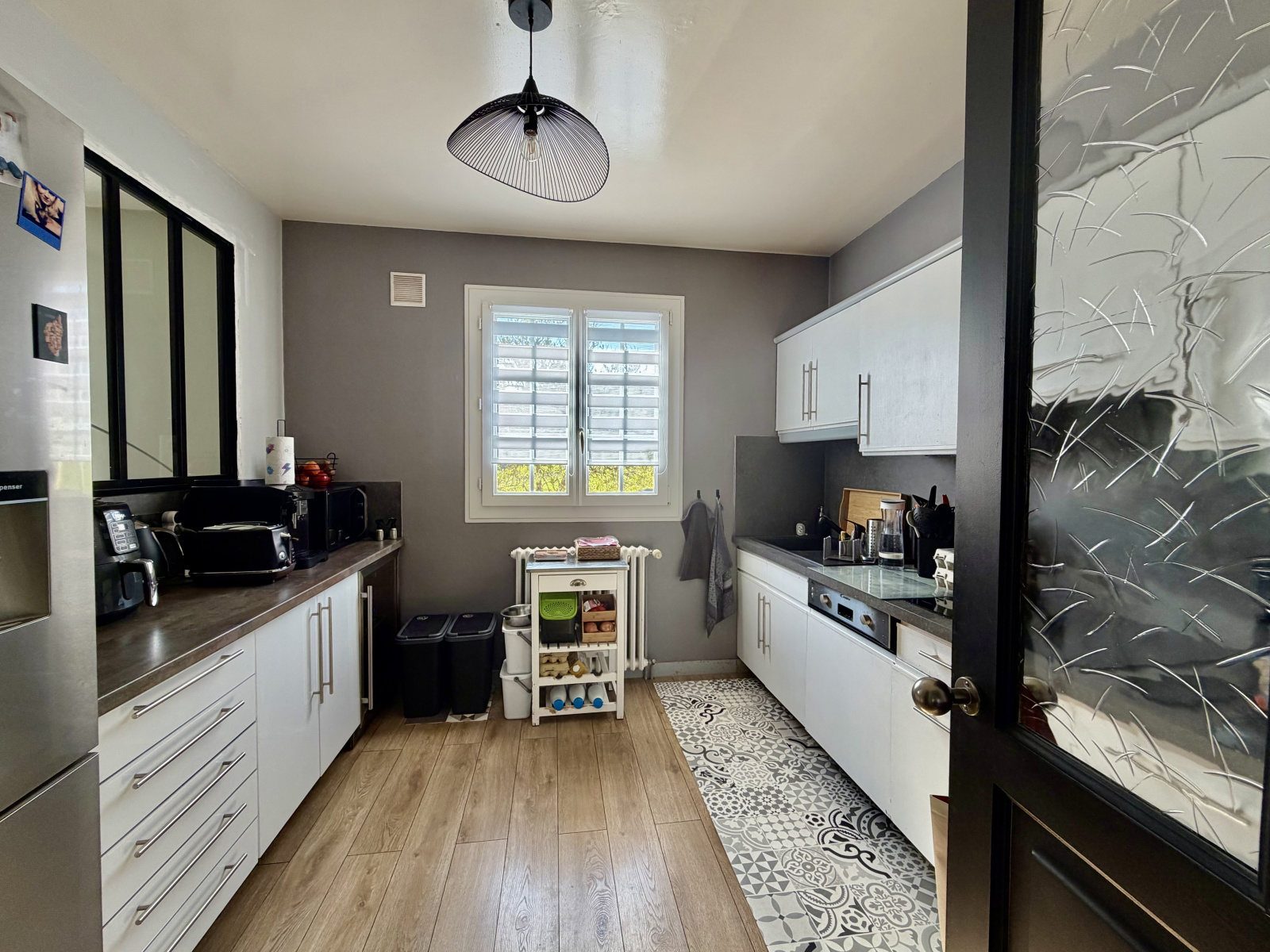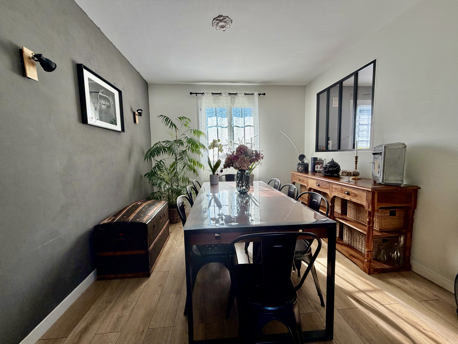 Elle se compose d'une entrée avec rangement ouverte sur le séjour salle à manger, une cuisine aménagée et équipée séparée, un dégagement desservant trois chambres dont une avec rangement, un WC séparé et une salle d'eau rénovée.