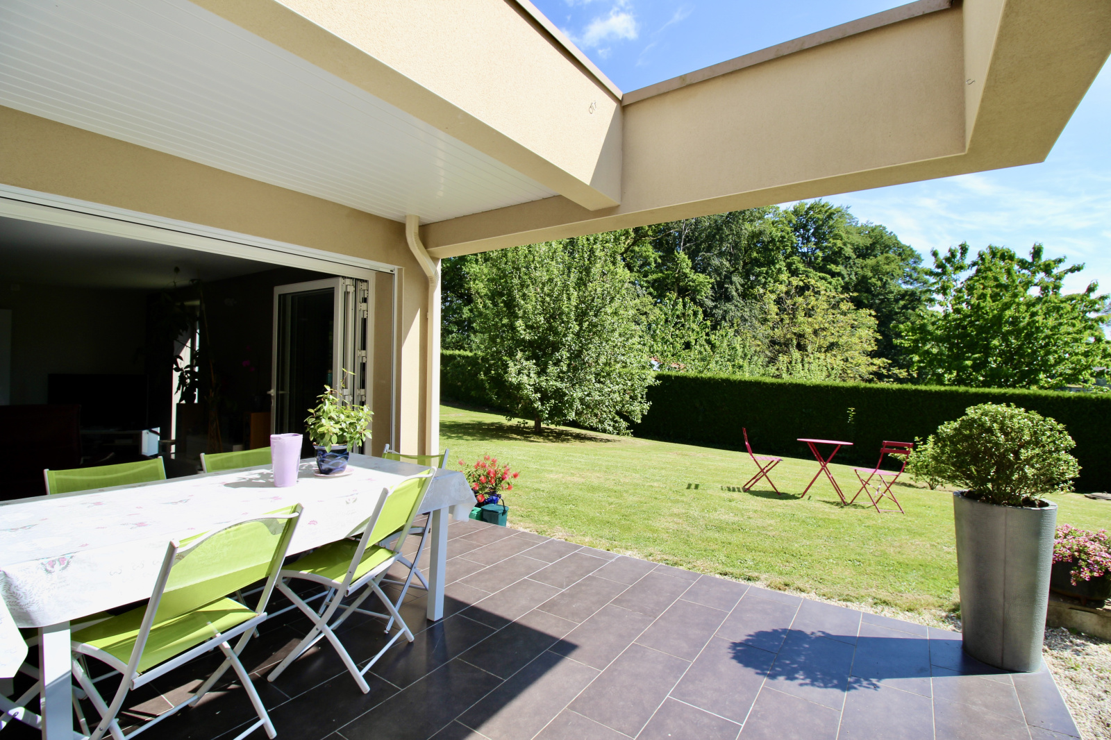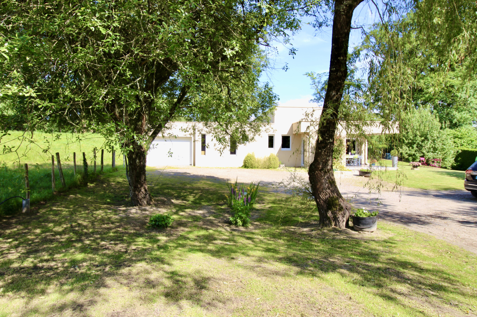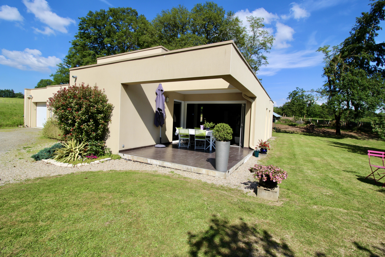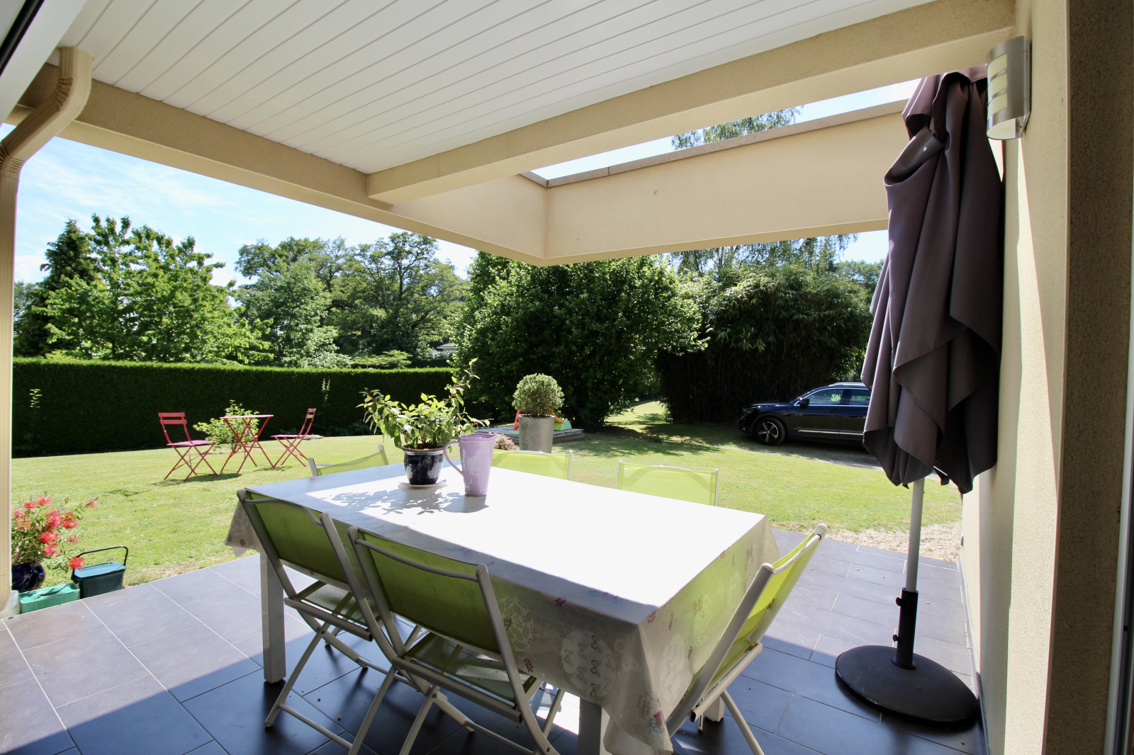 Egalement, vous profiterez sur l'avant d'une belle terrasse semi-couverte et son jardin joliment arboré et sans vis à vis. Son environnement campagne et sa proximité à Couzeix ou le Family village sont le bon compromis.
