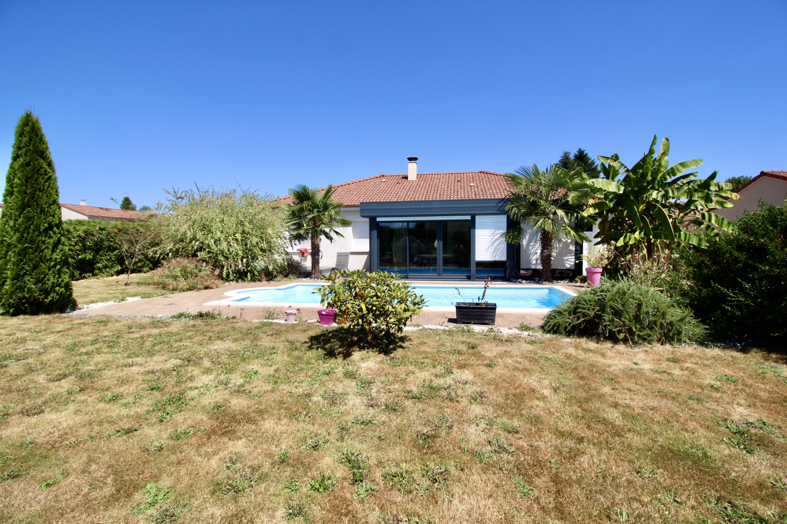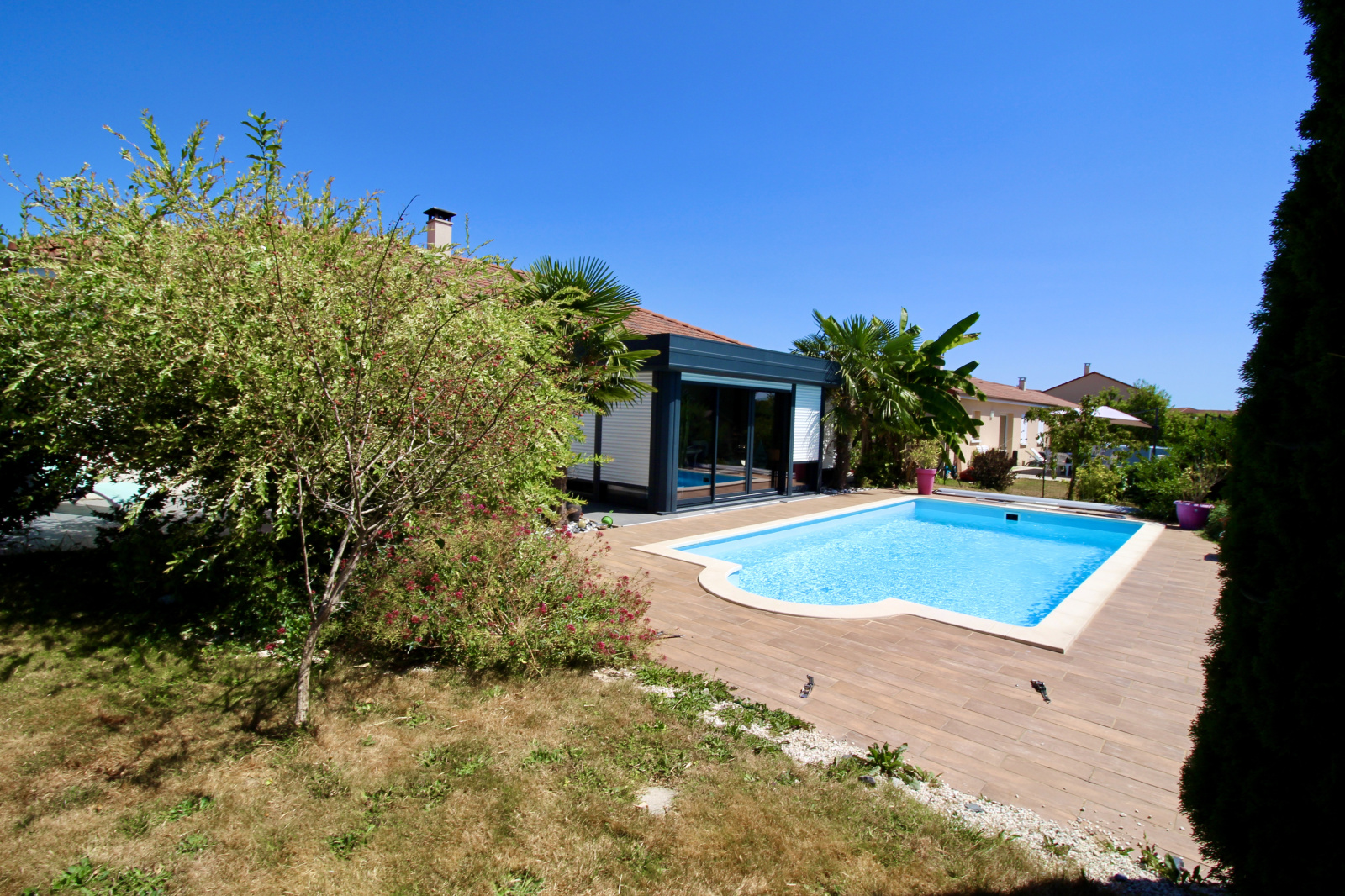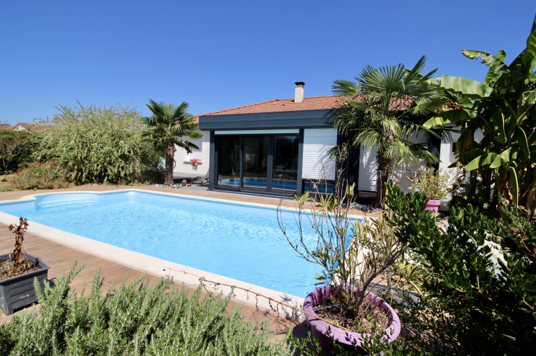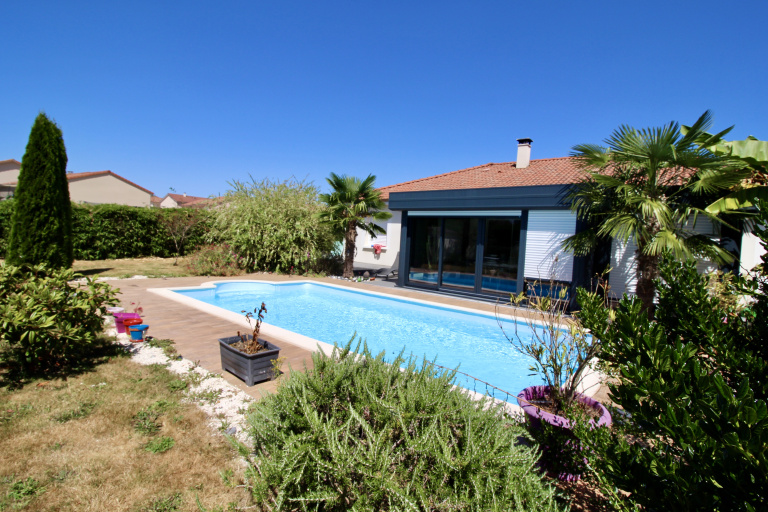 Voici une maison de plain pied avec garage et piscine qui sera vous ravir avec sa grande pièce de vie de plus de 40m² avec cuisine aménagée et équipée ouverte sur salon séjour et son espace bureau ouvert. En plus, de cette belle surface, vous profiterez d'une véranda de 2015 de 21m² donnant sur la piscine et le jardin joliment arboré de plus de 700m².