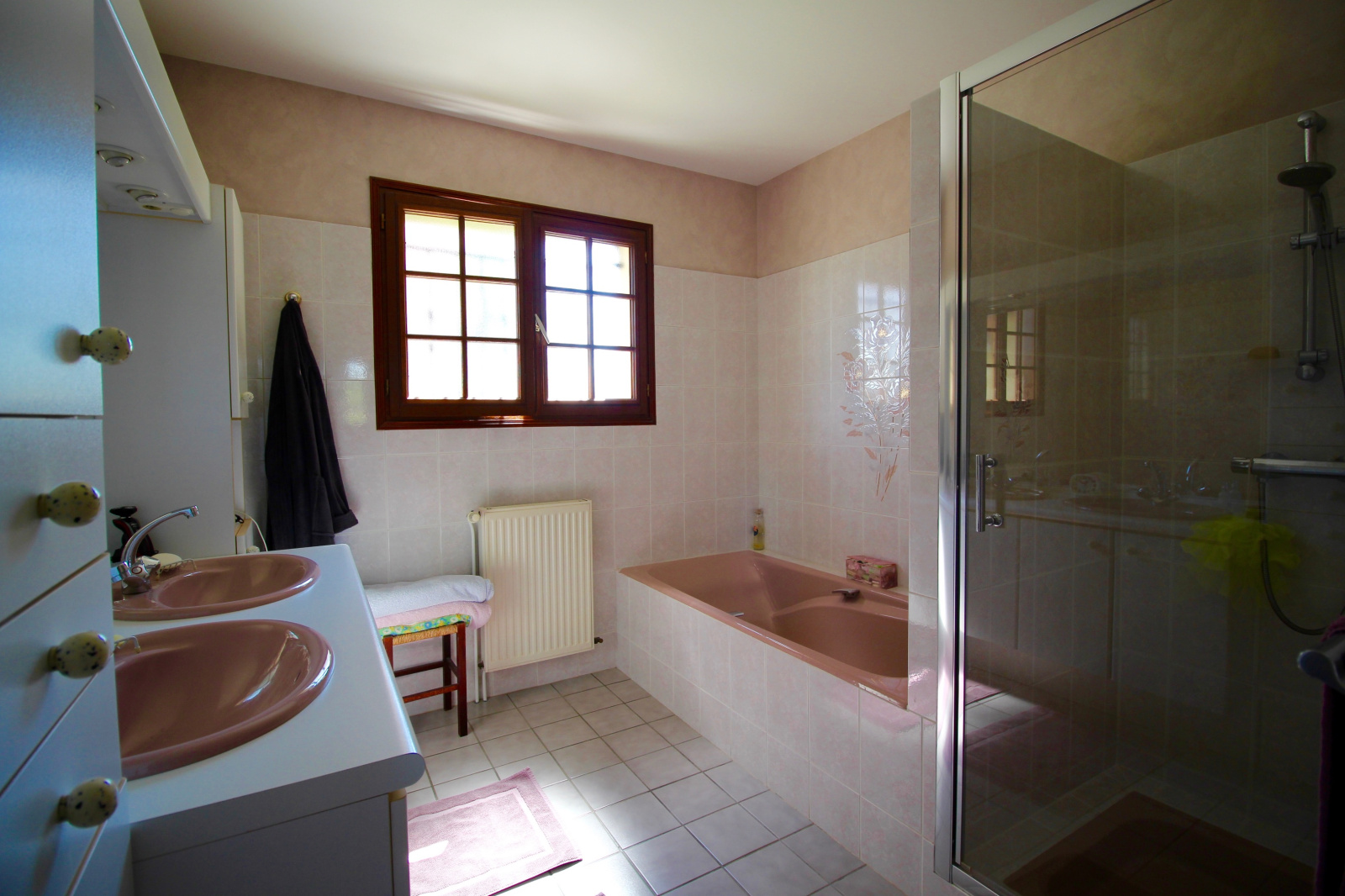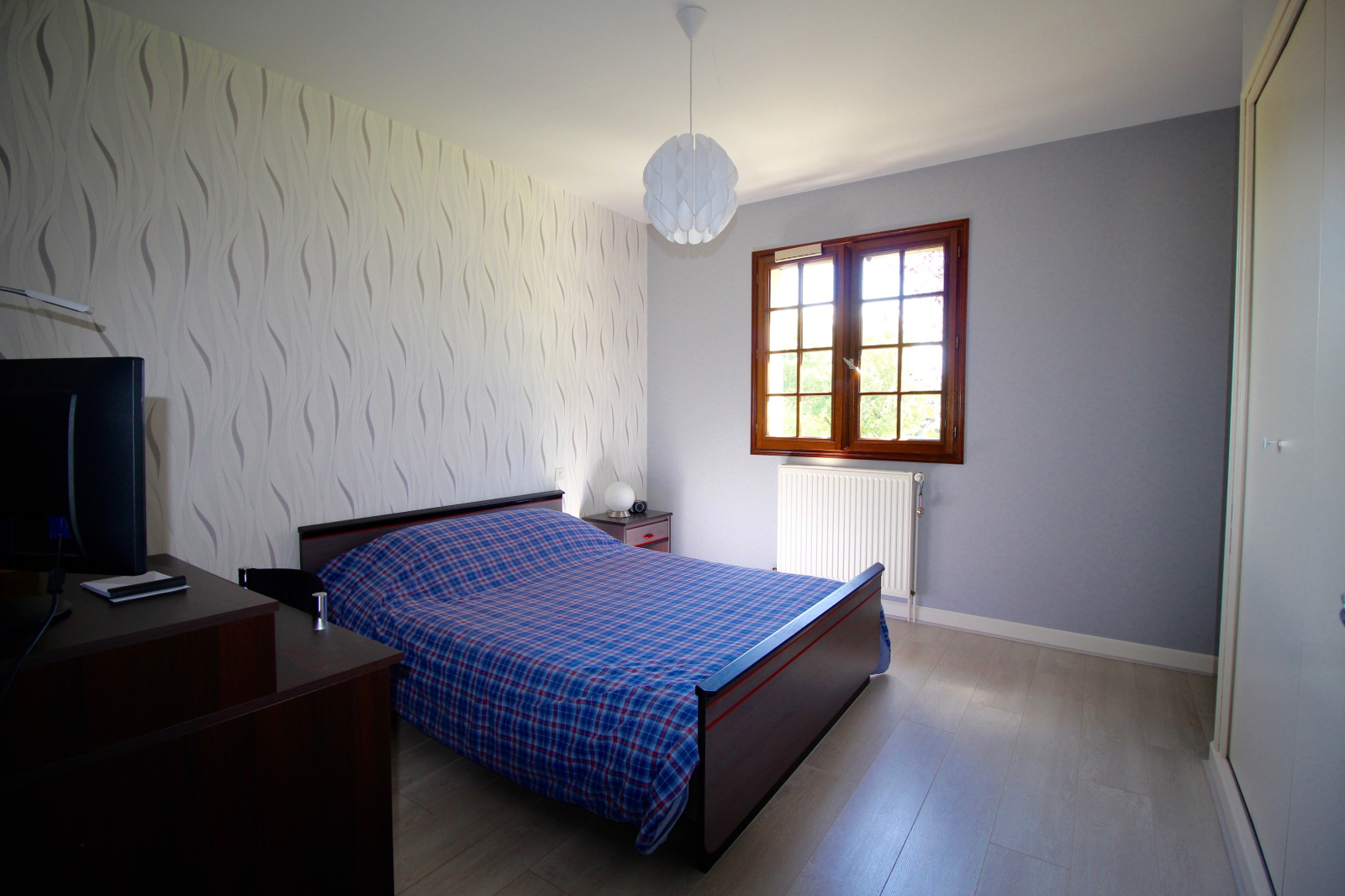 En demi-palier haut, vous trouverez la partie nuit avec trois chambres dont une avec rangements, une salle de bains avec douche et un WC séparé.