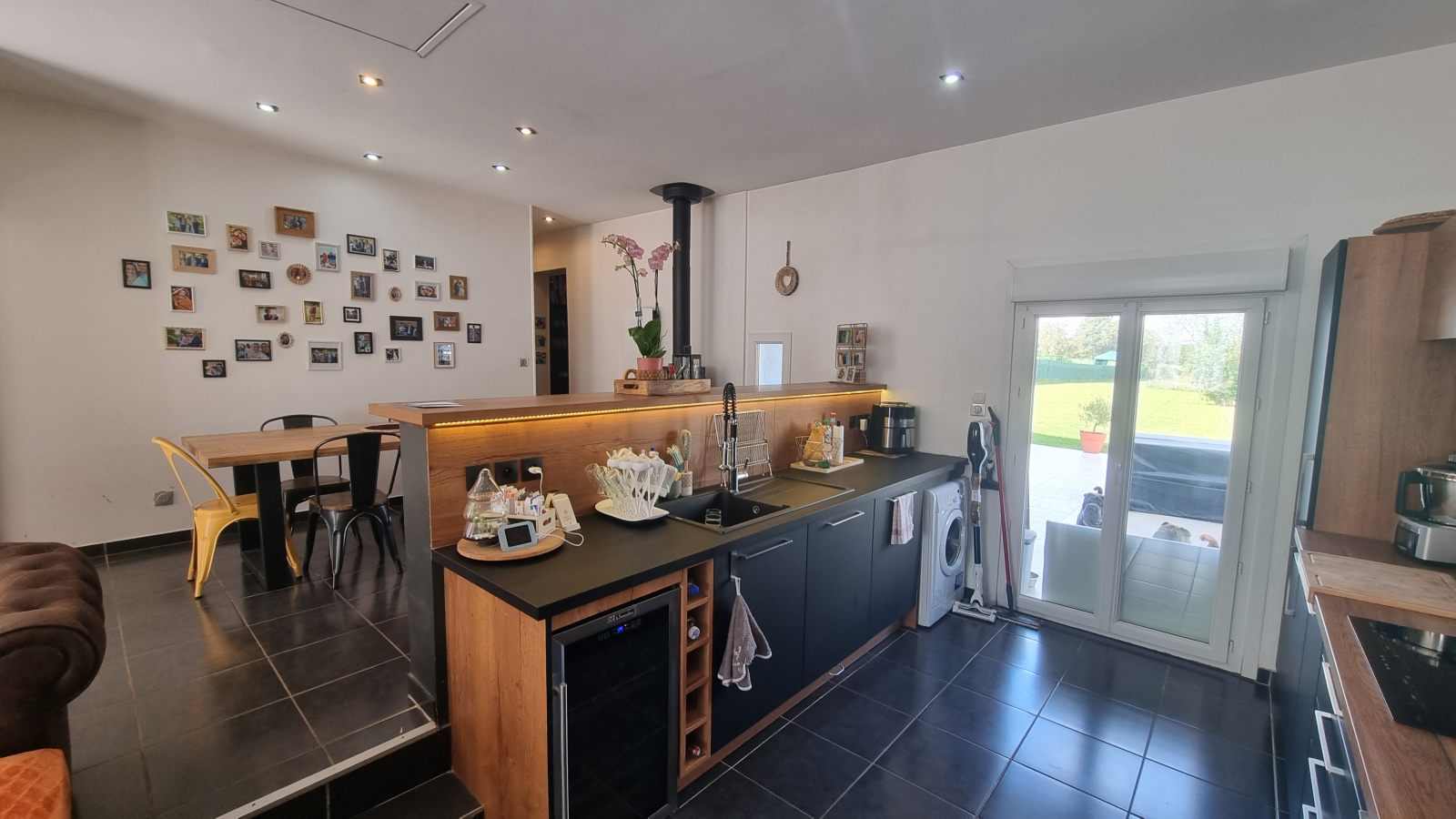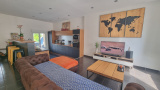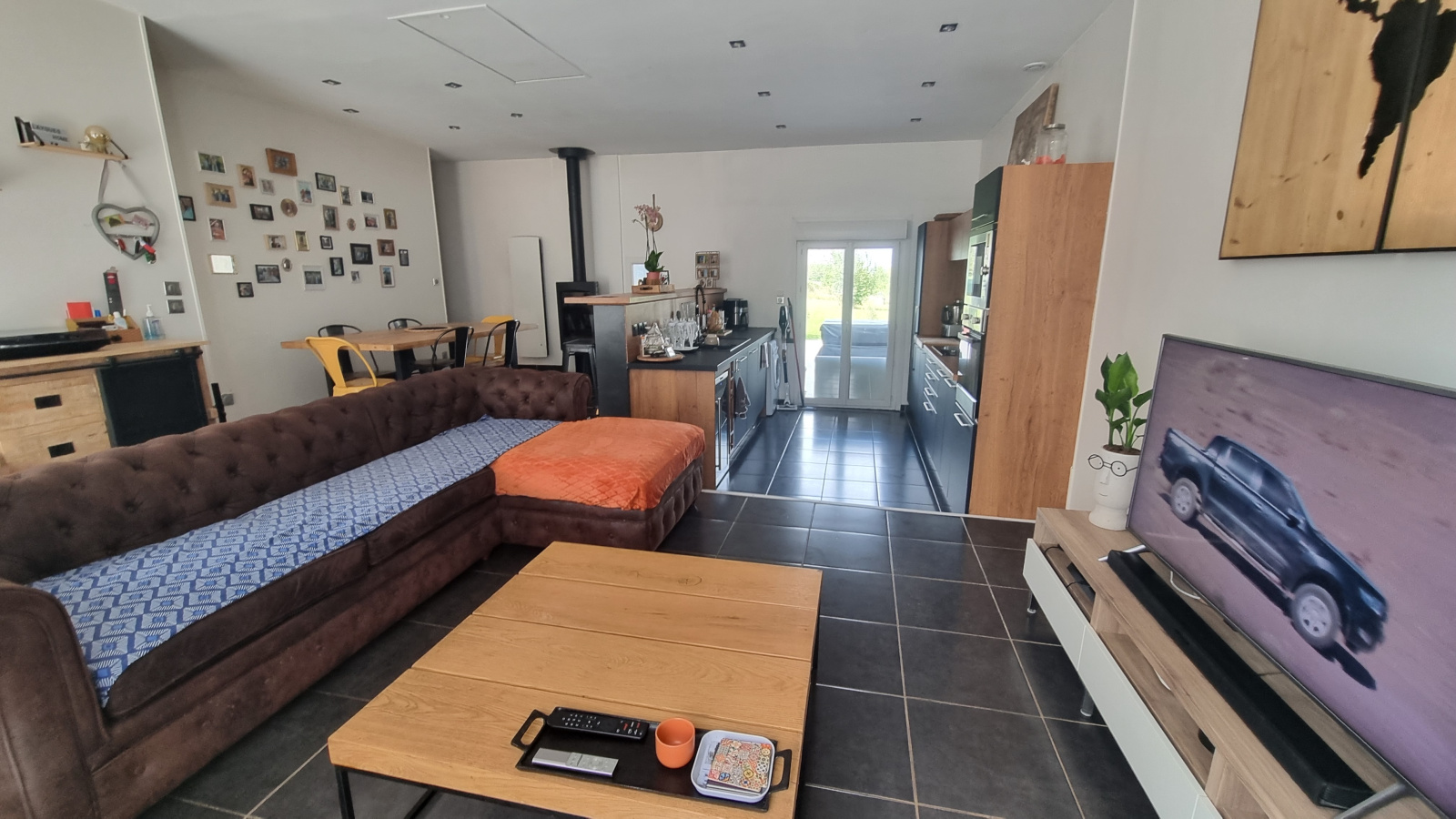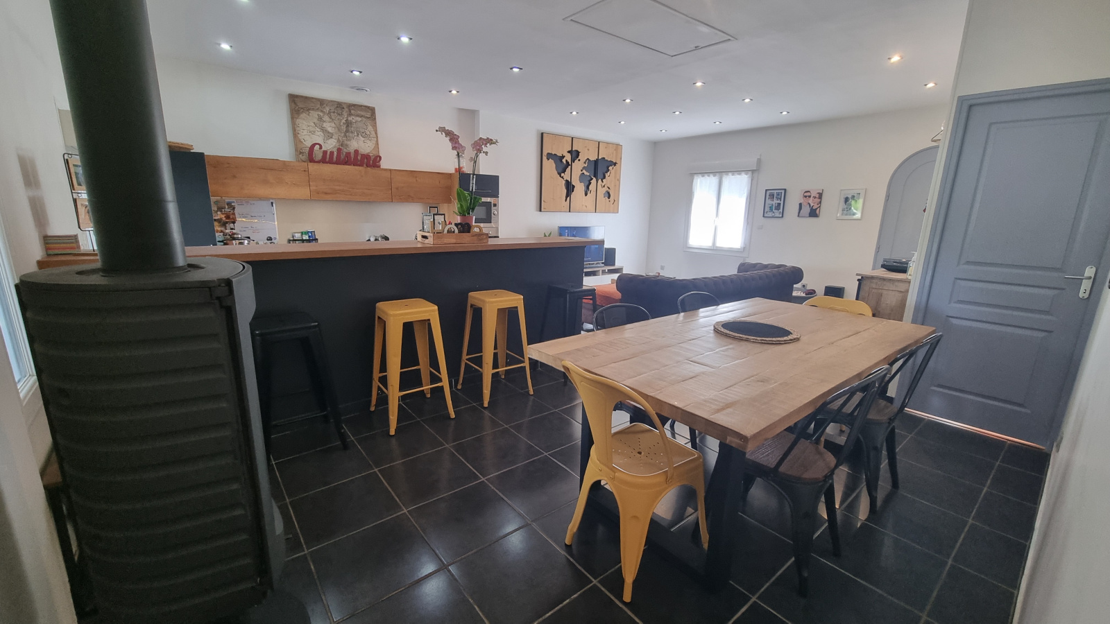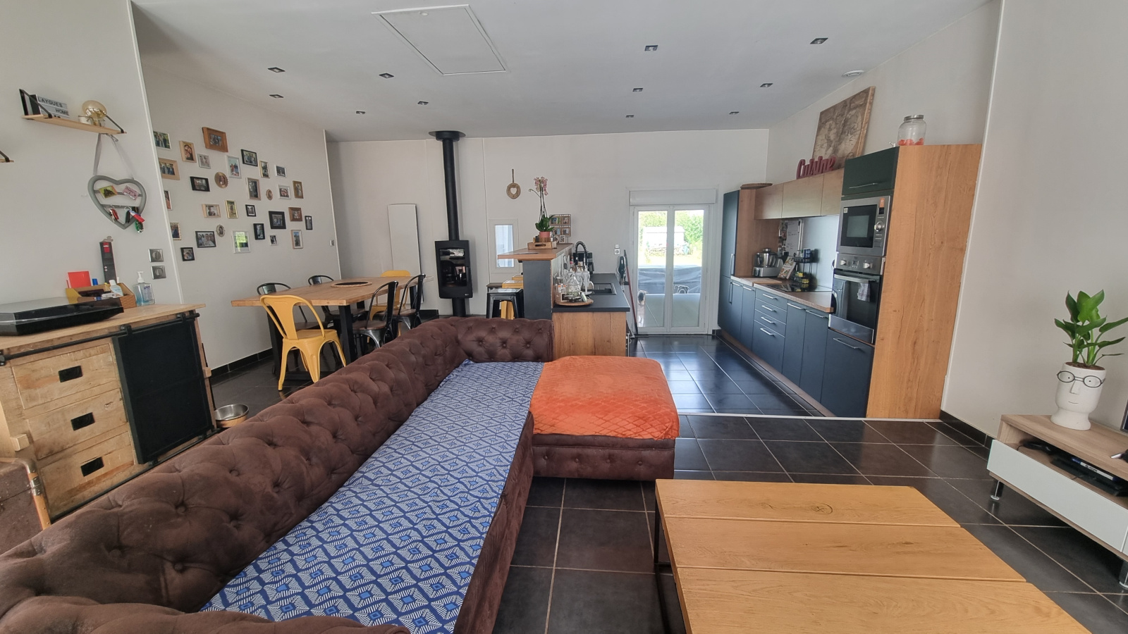 Cette maison de plain pied est composée d'un grand séjour avec poêle à bois ouvert sur une cuisine équipée et aménagée, de deux chambres, d'un dégagement, d'une salle d'eau avec WC et d'un cellier/dressing. Cette maison est très lumineuse et bien rénovée. La cuisine donne directement sur une grande terrasse à l'abri des regards pour profiter des beaux jours.