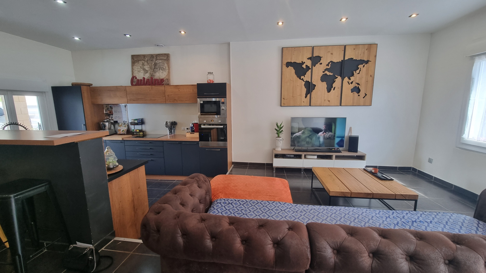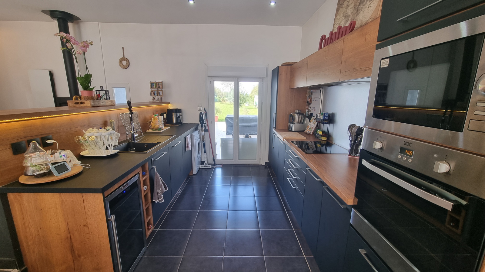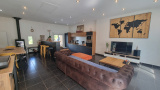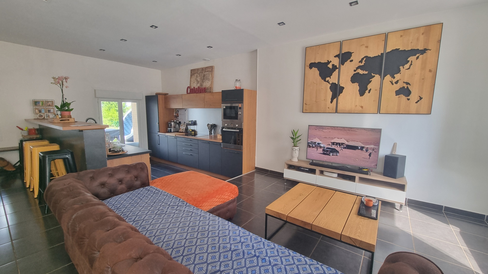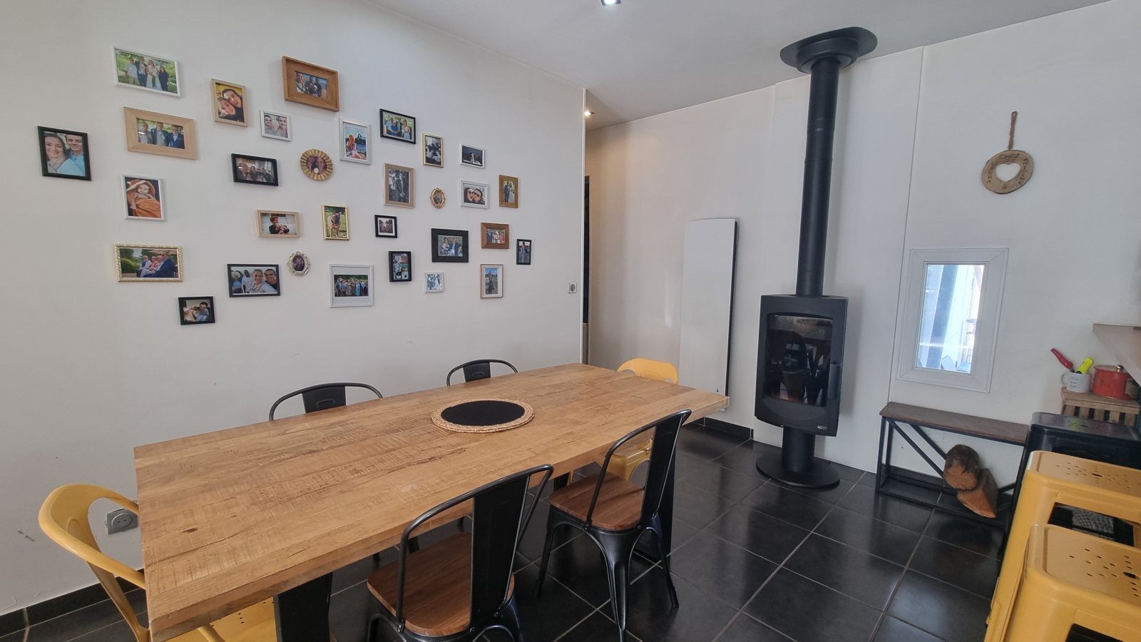Cette maison de plain pied est composée d'un grand séjour avec poêle à bois ouvert sur une cuisine équipée et aménagée, de deux chambres, d'un dégagement, d'une salle d'eau avec WC et d'un cellier/dressing. Cette maison est très lumineuse et bien rénovée. La cuisine donne directement sur une grande terrasse à l'abri des regards pour profiter des beaux jours.