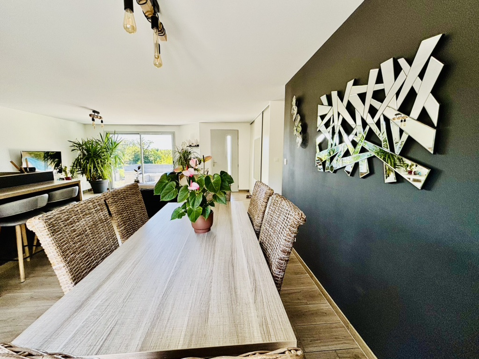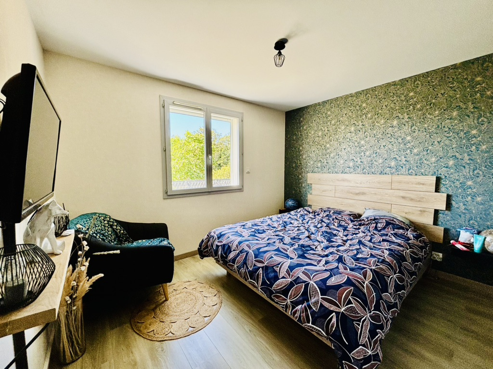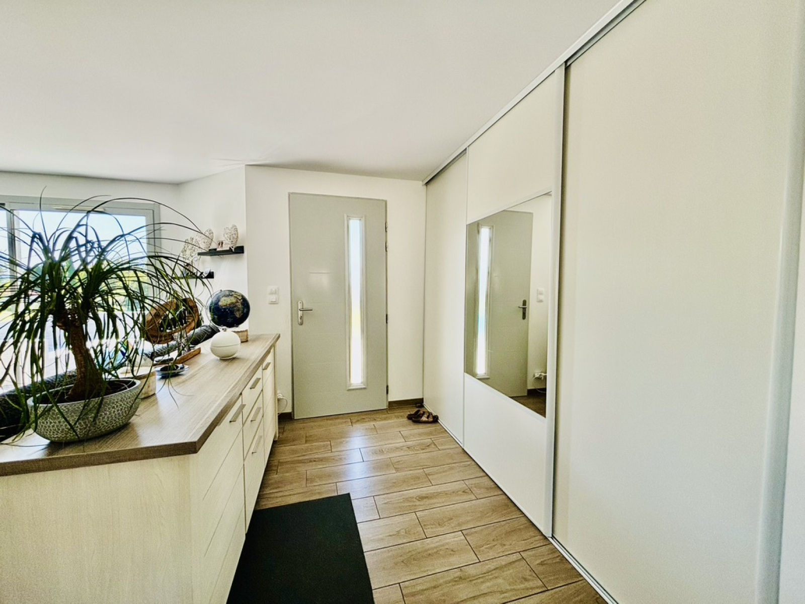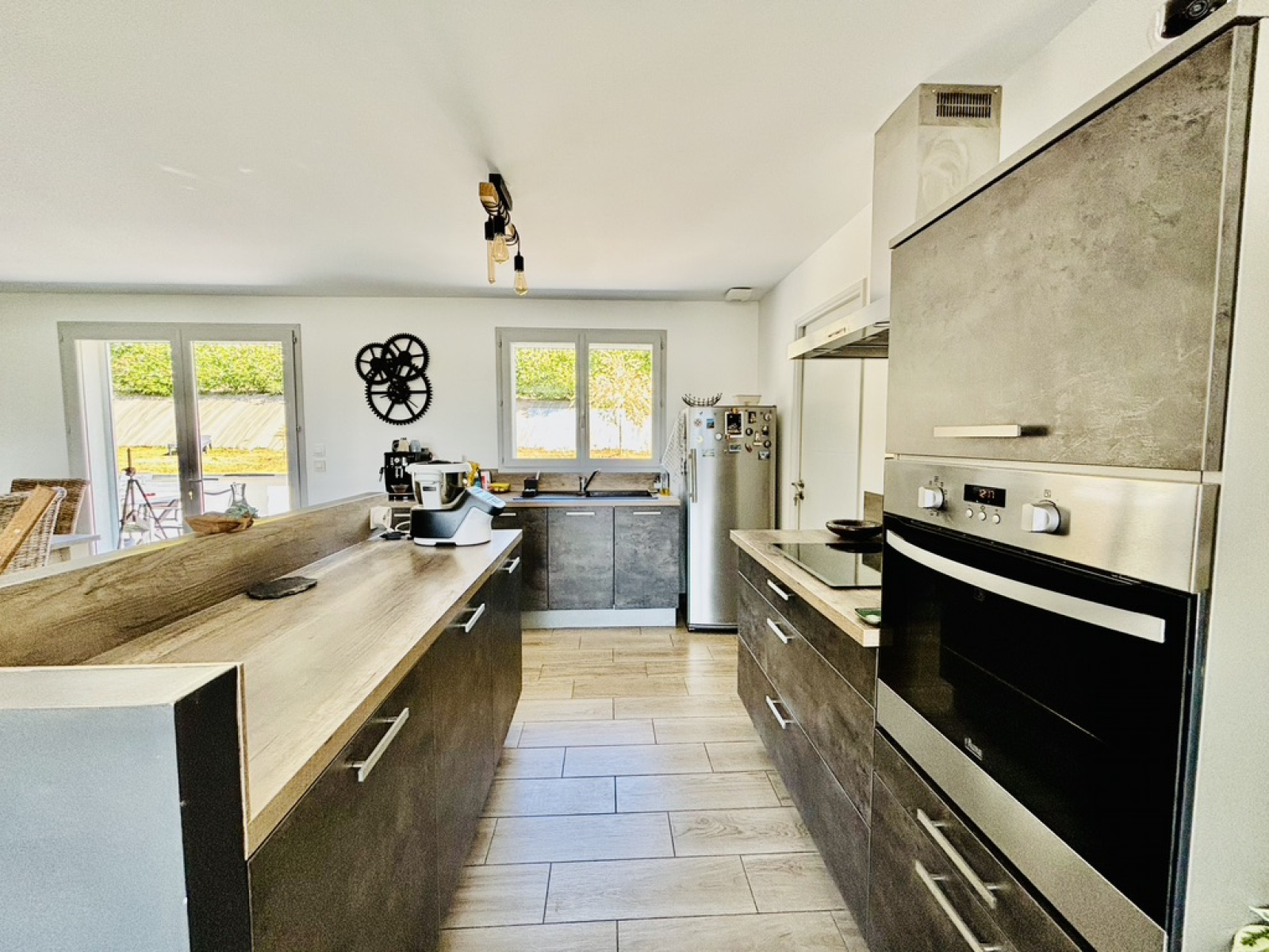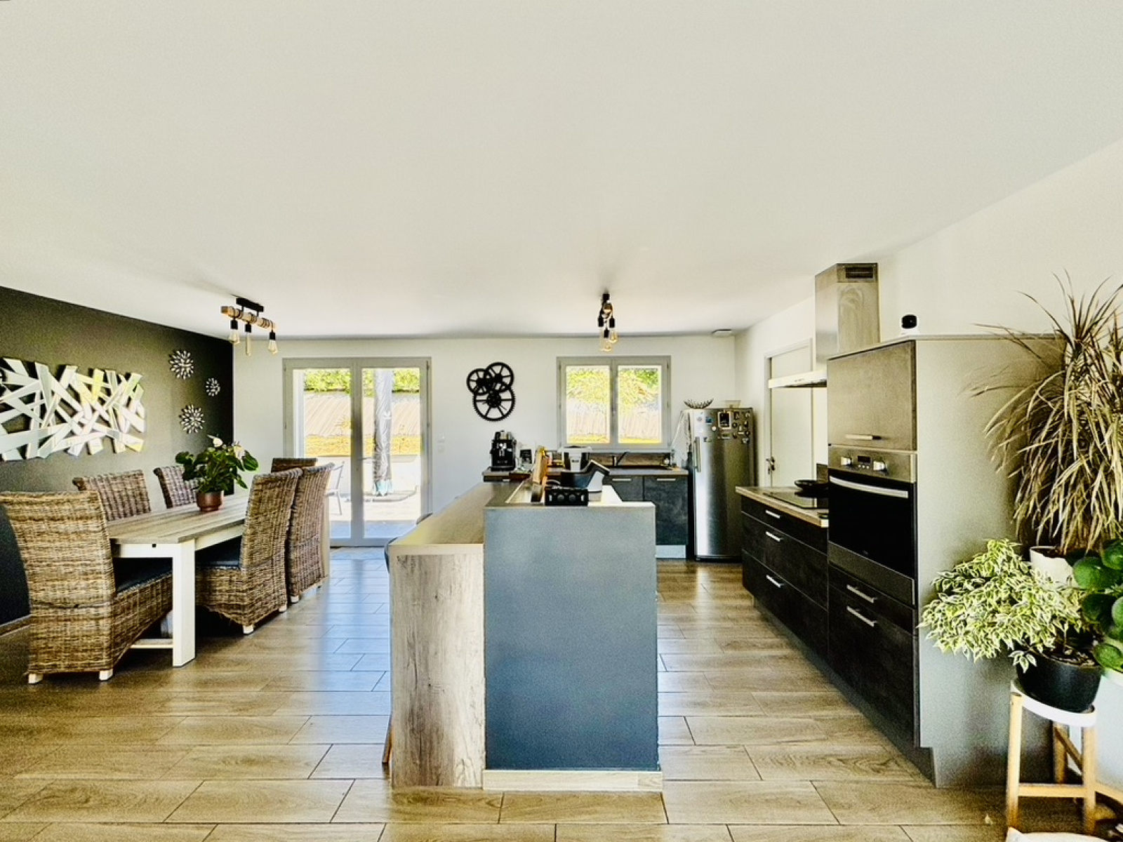 La maison se compose d'une entrée avec rangement, d'une pièce de vie avec cuisine ouverte aménagée et équipée, d'un cellier et garage attenant. De l'autre côté, la maison offre la partie nuit avec 3 chambres dont deux avec rangement et une avec dressing, une salle de bains et un WC séparé.