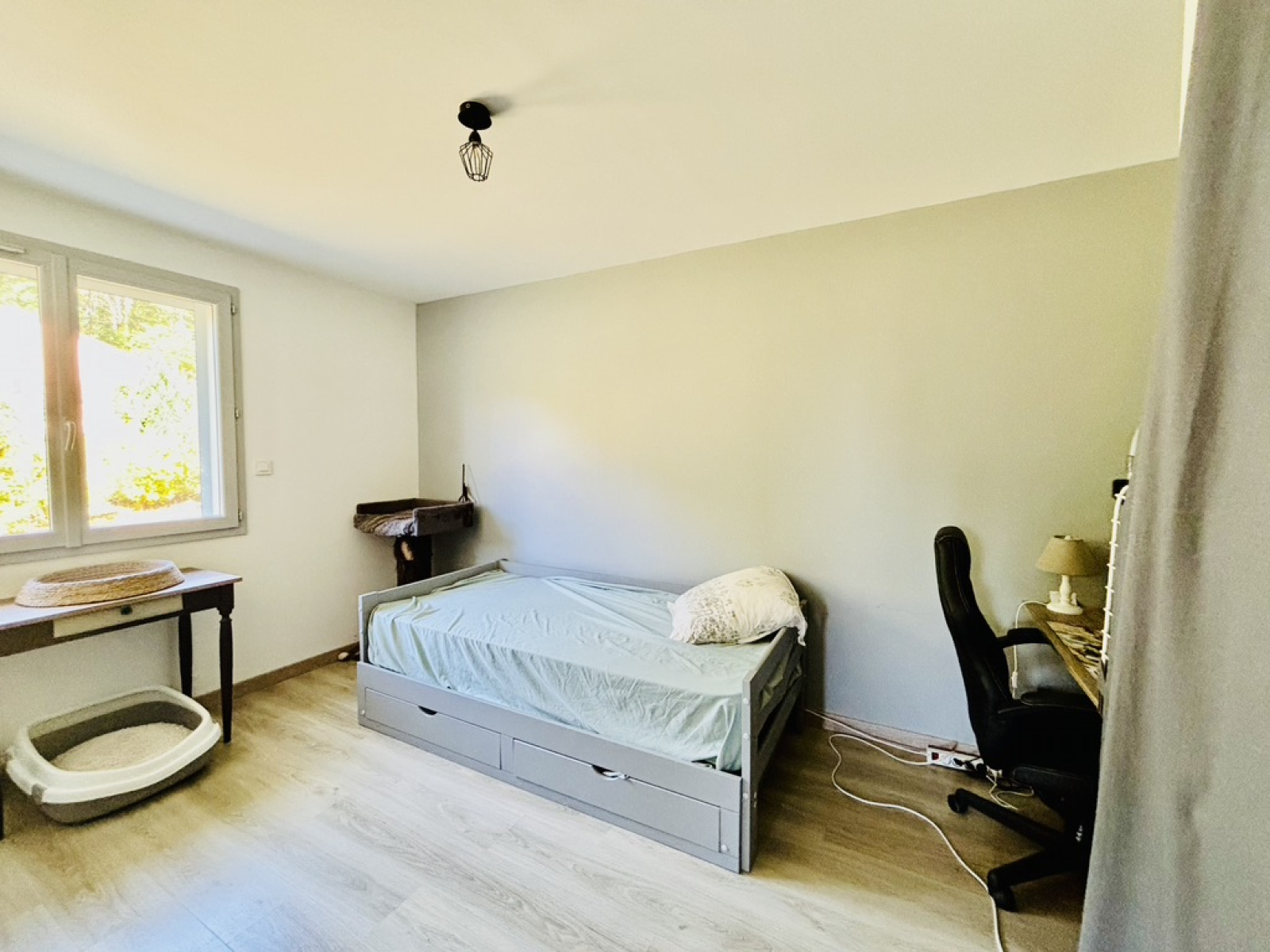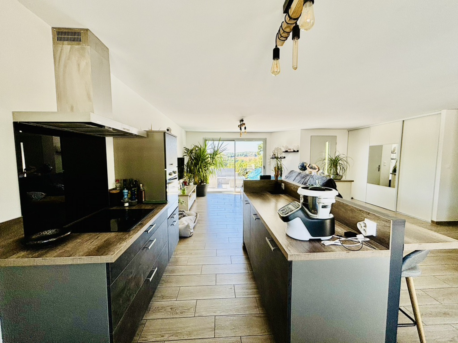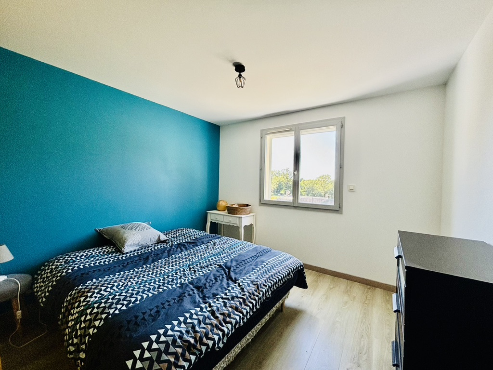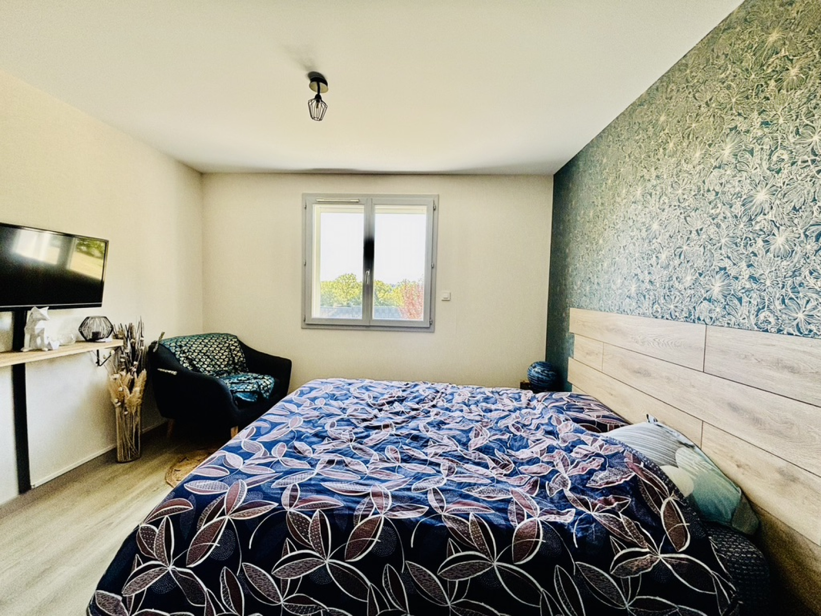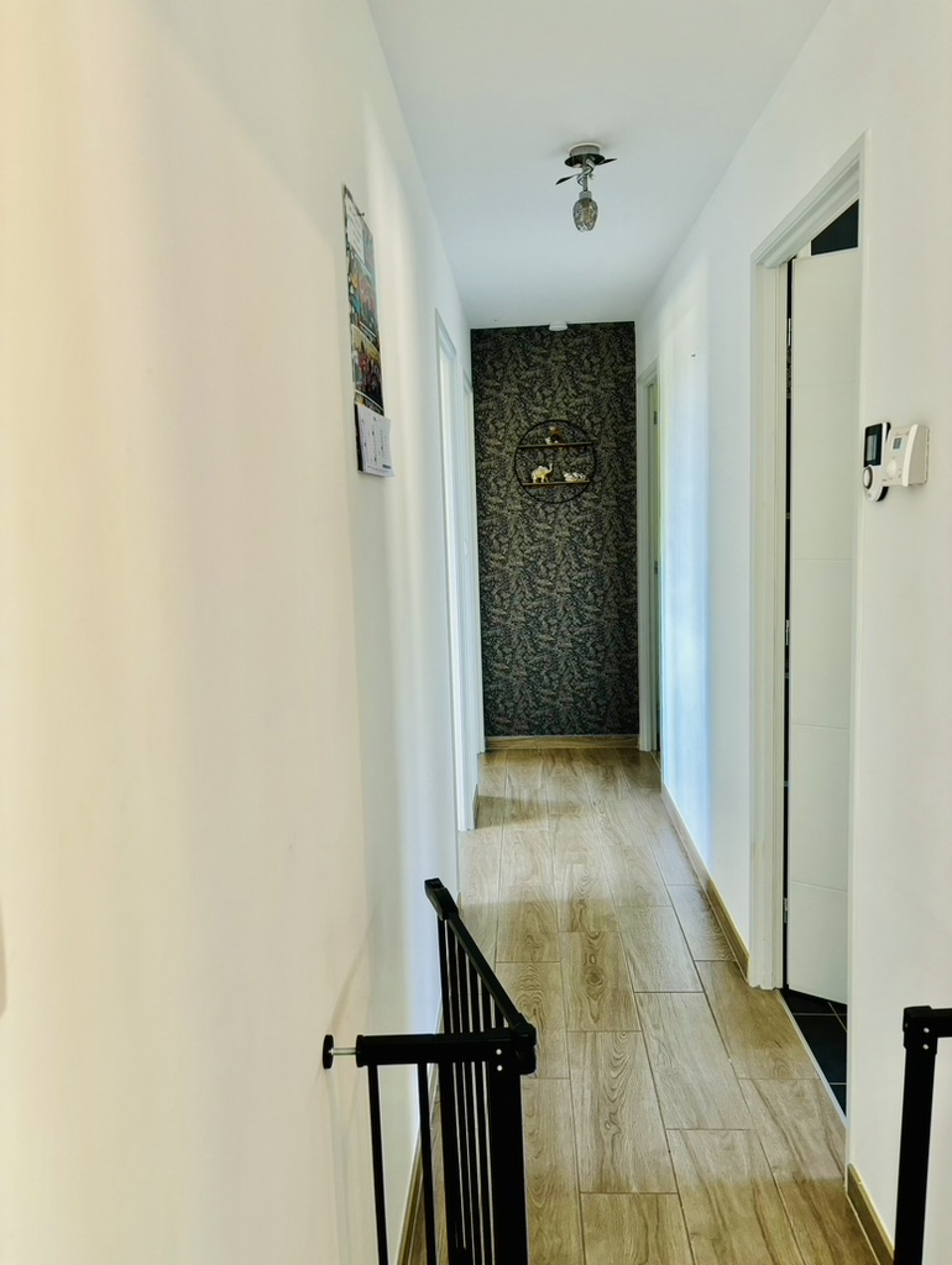 La maison se compose d'une entrée avec rangement, d'une pièce de vie avec cuisine ouverte aménagée et équipée, d'un cellier et garage attenant. De l'autre côté, la maison offre la partie nuit avec 3 chambres dont deux avec rangement et une avec dressing, une salle de bains et un WC séparé.